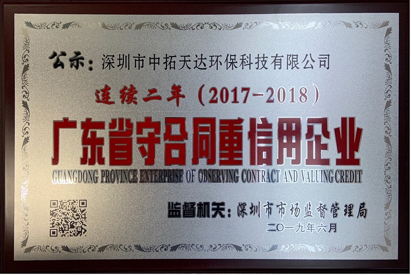 中拓天達公司始終堅持把守合同、重信用視為企業經營發展的根本,且在誠信建設、合同管理、守信經營等方面不斷完善,依托產品技術的創新,以及服務質量的提升,從而贏得客戶以及社會各行業的高度信賴。此次,公司再度獲評“廣東省守合同重信用企業”榮譽,是社會各界對中拓天達公司多年誠信經營的肯定。為此,公司未來將繼續以此為契機,通過加強信用、合同等管理,完善公司誠信體系建設,在互信互助、坦誠合作的基礎上不斷開拓進取,與客戶建立互惠互利、共同發展的穩定關系,從而更好地發揮公司在環保行業的示范帶頭作用,為客戶提供更優質的純水、廢水處理、廢水回用等方面的服務。