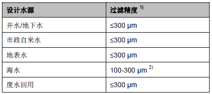 注:1)實際項目的過濾精度根據具體水質條件和項目的具體要求確定;