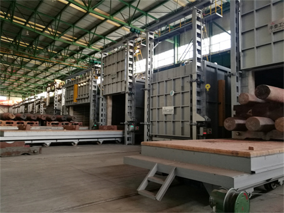 臺車爐為長方箱形結構,承重平臺為可移動小車,工件堆放在工作臺上,進出電動傳動,爐門上下開關,電動控制;爐襯采用全纖維硅酸鋁甩絲毯制成模塊筑成爐體,爐底采用輕質保溫磚和重質耐火磚砌筑,加熱元件采用電阻絲和電阻帶加熱,爐體外殼采用鋼板和型鋼制作,爐門、臺車采用機械傳動;具體配置按客戶和爐溫要求設計配備。